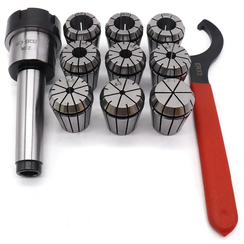 Product Name: 9Pcs Er32 Spring Collets Set 2/4/6/8/10/12/16/18/20Mm + 1Pcs Mt3 M12 Er32 Collet Chuck Morse Taper Holder Collet Power Tool Set